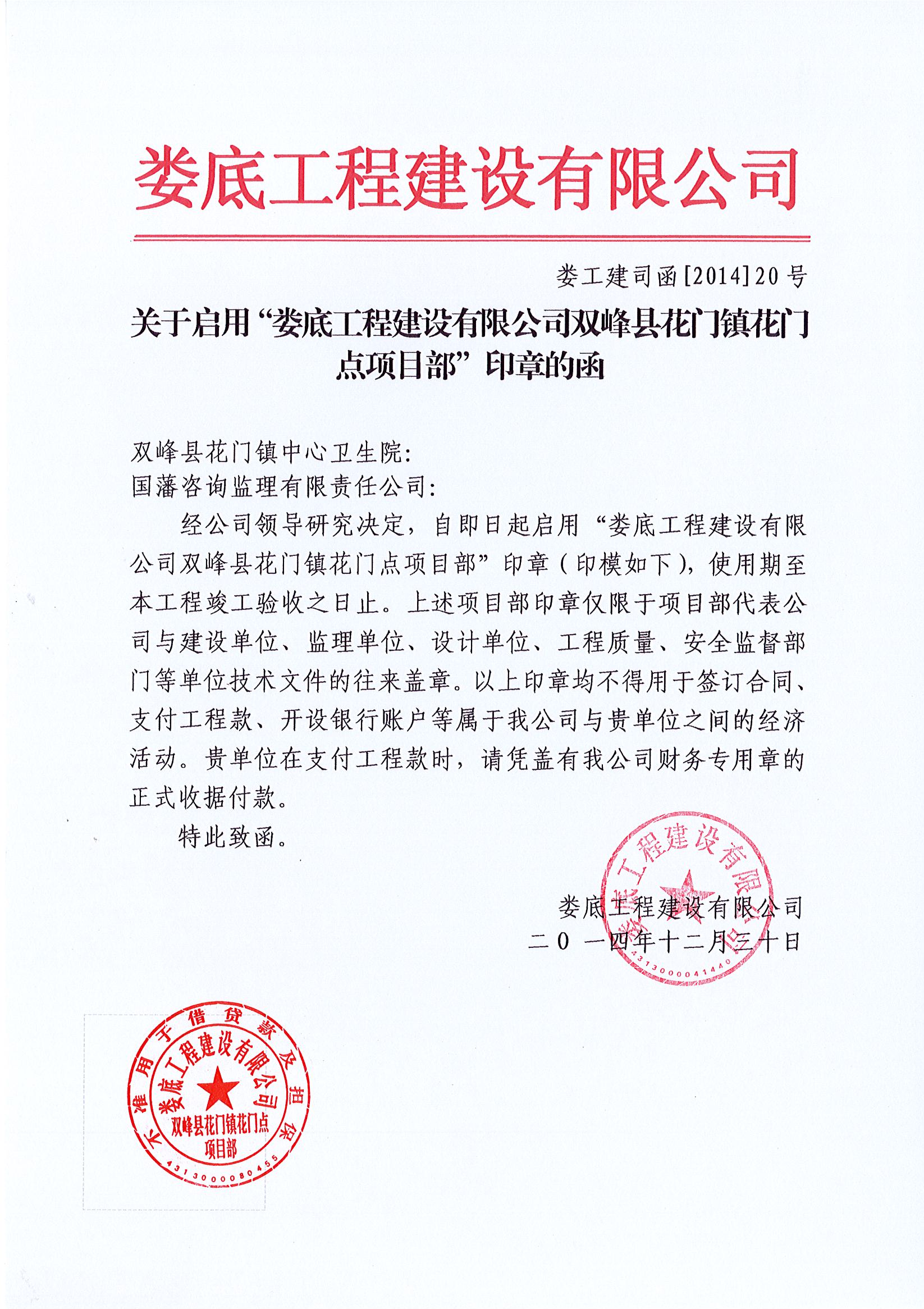 關于啟用雙峰縣花門鎮花門點項目部章的通告