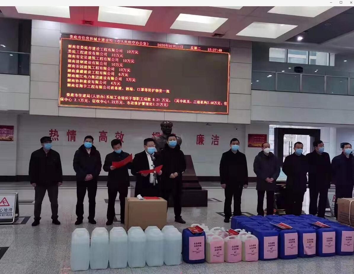 “病毒無情人有情”、“一方有難八方支援”!2020年2月11日,在婁底市住建局(人防辦)組織的市住建(人防)領域建筑業企業、房地產企業及局(辦)系統工會“抗擊疫情,勇擔責任”捐贈儀式上,公司總經理、法人代表胡勁代表婁底工程建設有限公司捐贈人民幣10萬元,為抗擊新冠病毒肺炎疫情盡企業的一份社會責任。公司董事長張愛慧參加了捐贈儀式。